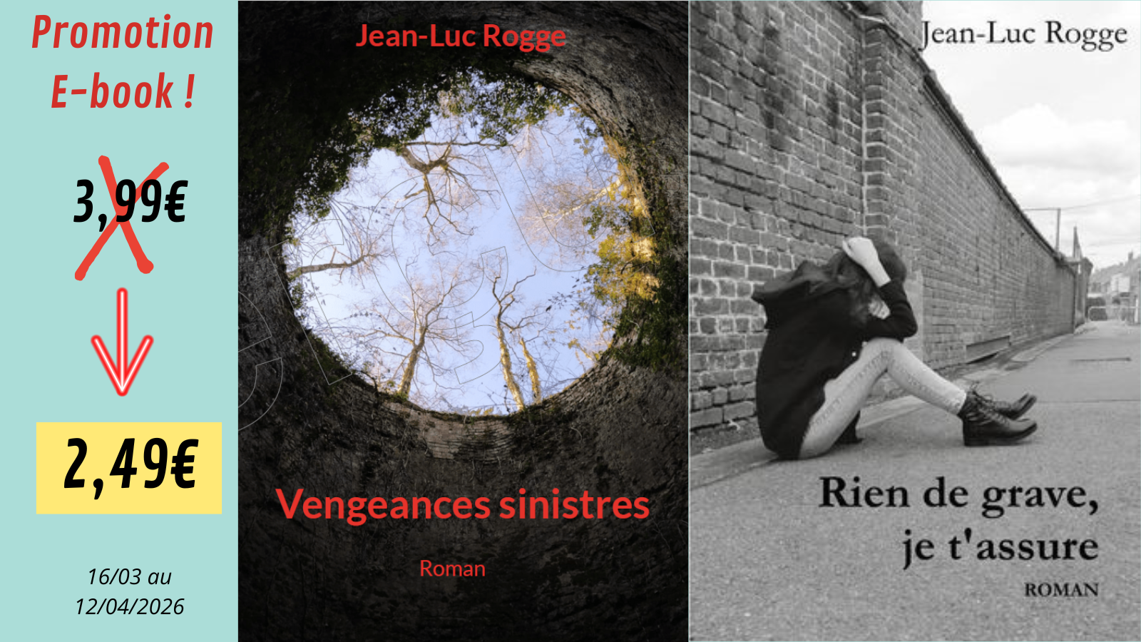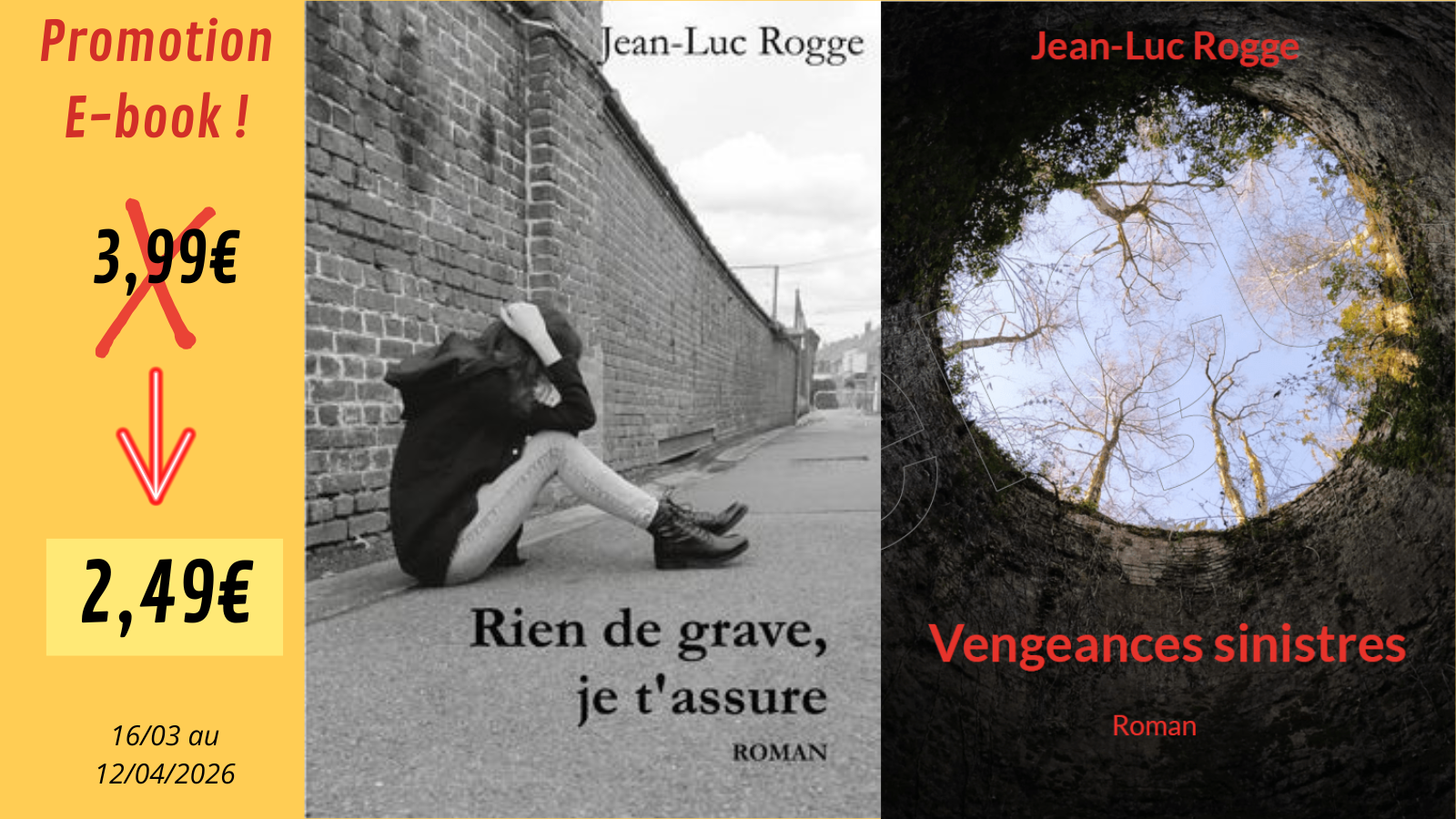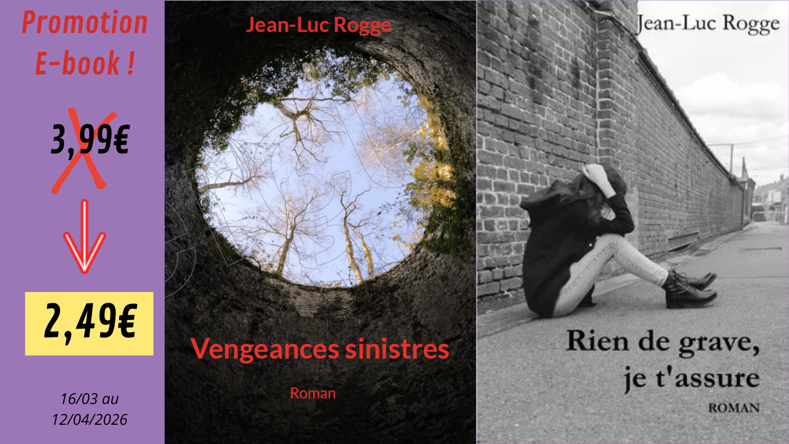 Avides de romans noirs aux rebondissements continus ? D'intrigues psychologiques bien ancrées dans la réalité ? Foncez !!! "Vengeances sinistres" et "Rien de grave, je t'assure", sont en promotion en version e-book pour quelques jours encore. Bienvenue dans un univers où, sous l'apparente normalité des êtres, ébranlés par les rebondissements inattendus du quotidien, se révèlent des failles insoupçonnées.